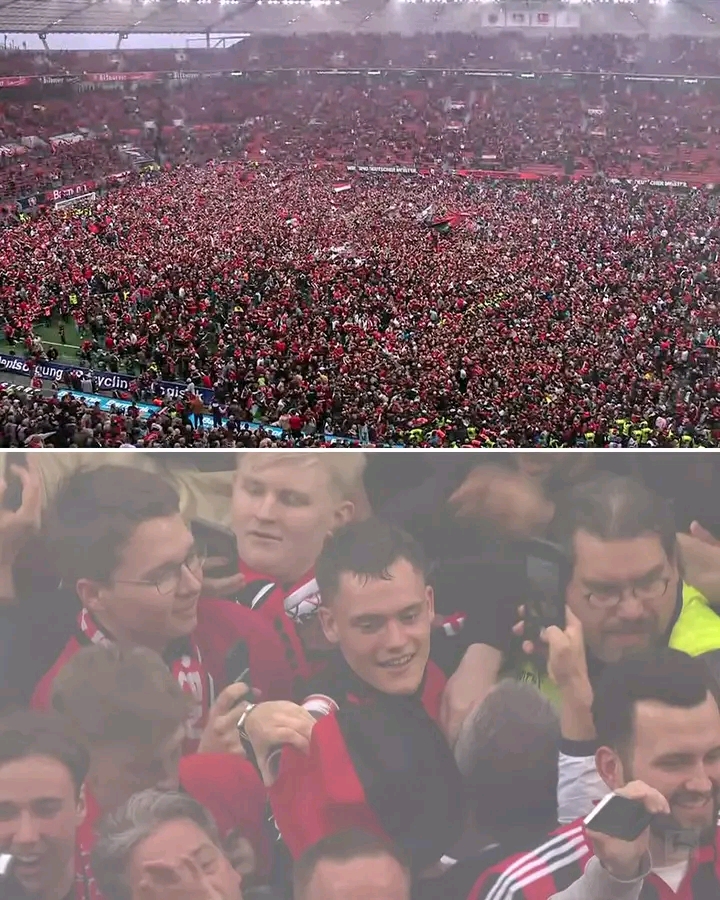 Bayer Leverkusen fans invade the pitch to celebrate their team