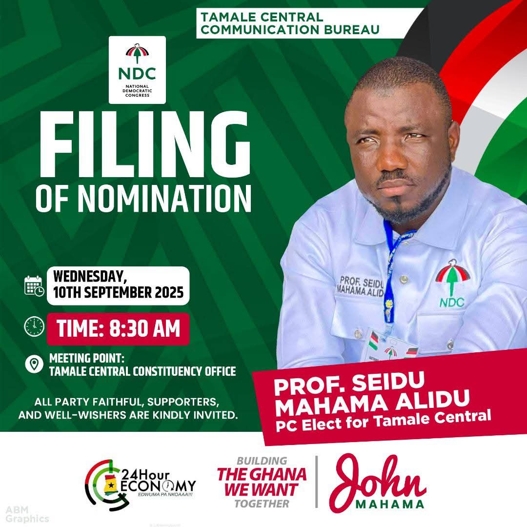 The NDC Parliament Candidate for Tamale Central Constituency Prof. Alidu Mahama Seidu has filed his nomination forms to contest the upcoming by-election slated for 30th September 2025.