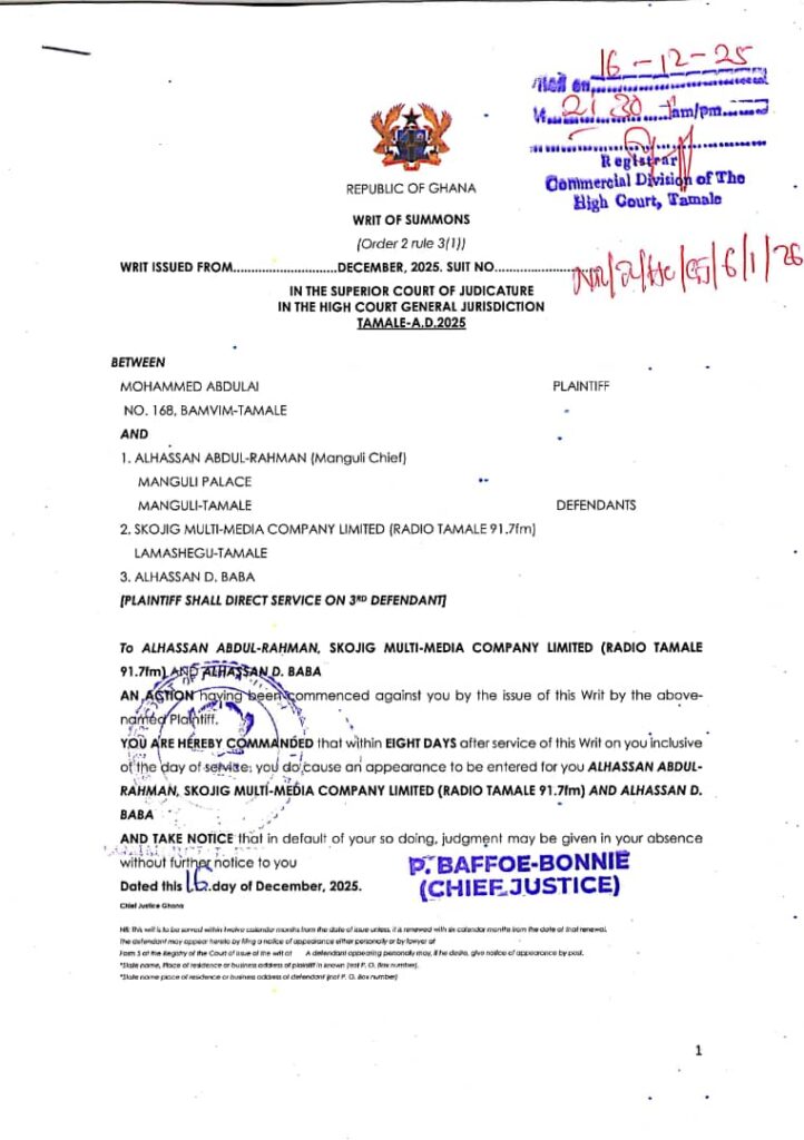 The Secretary of late Bamvim Chief, Mr.Mohammed Abdulai has filed a defamatory suit against Chief of Manguli, Alhassan Abdul-Rahaman and Radio Tamale for damaging his hard-earned reputation beyond repairs through publication of Press Conference organized by the Former.