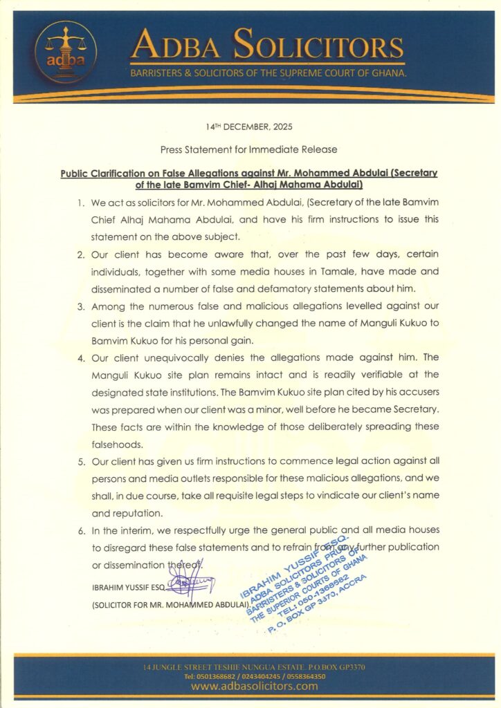 The Solicitors for Mr.Mohammed Abdulai, the Secretary of the Late Bamvim Chief, have dismissed allegations claiming their client unlawfully changed the name of Manguli-Kukuo to Bamvim-Kukuo for his personal gain, warning to take legal action against persons and Media outlets peddling what they describe as ‘falsehood and malicious allegations’ intended to smear his hard-earned reputation.