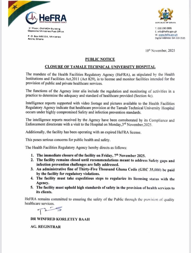 The close down of the facility follows the intelligence reports received by HeFRA corroborated by its Compliance and Enforcement directorate following a visit to the Hospital on Monday, 3rd November, 2025.